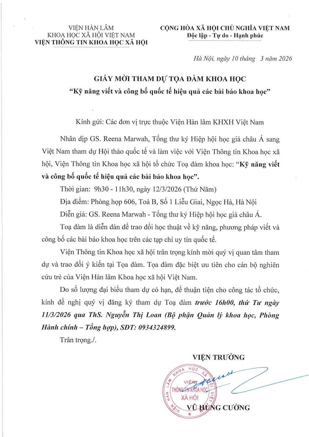Giấy mời tham dự Tọa đàm khoa học “Kỹ năng viết và công bố quốc tế hiệu quả các bài báo khoa học”